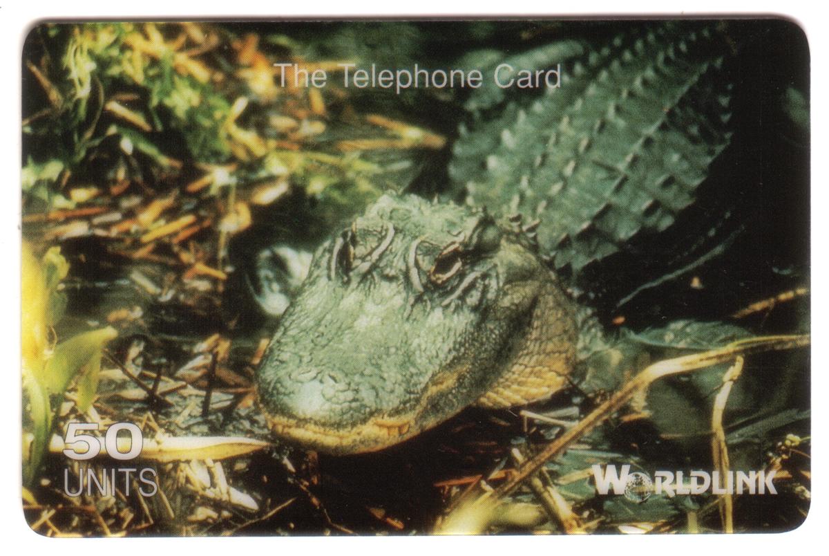 Text on the card includes "WorldLink Communications" and “50u,” indicating the card’s value. The language used is English. Additional text details the card’s connection to travel, tropical sightseeing, wild animals, reptiles, aquatic wildlife, and nature, situating this collectible within a nature-themed series. The card’s design visually communicates themes of wildlife and natural ecosystems, specifically focusing on the alligator in a swamp environment.