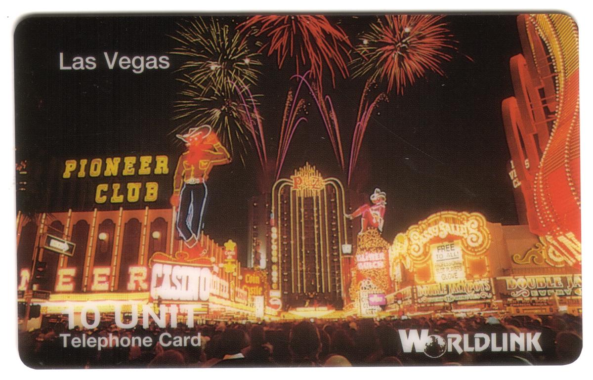 At the bottom left, the card indicates "10 UNIT Telephone Card" in white text, showing the card’s value and purpose. On the bottom right, the WorldLink logo, stylized with a globe design incorporated into the text, identifies the issuer of the card. This card serves as a collectible piece celebrating the lively Las Vegas entertainment district, highlighting famous casino landmarks and festive nighttime energy.