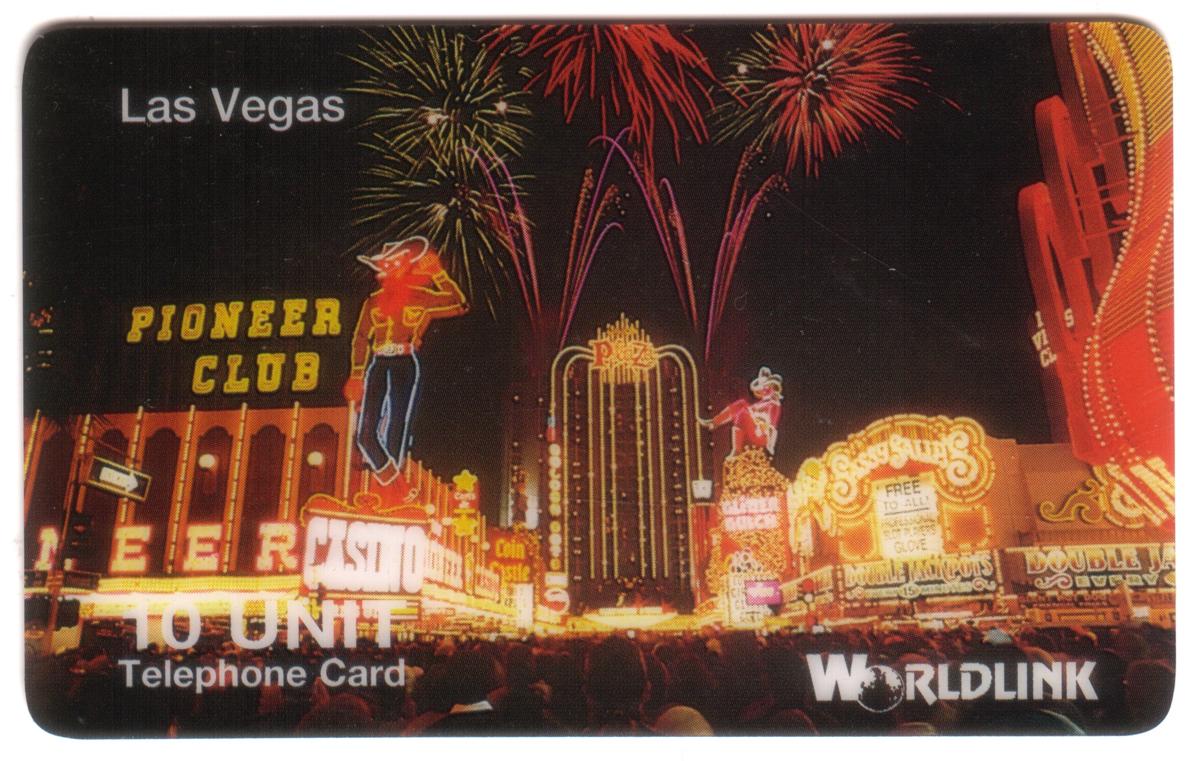 The card prominently displays the text "Las Vegas" in the upper left corner and “Pioneer Club” in large yellow letters atop a casino building near the left side. The word "CASINO" appears vertically in large red letters on the left-middle portion of the card, while "COIN CASTLE" can be seen among the bright neon signage toward the center. On the right side, the sign for "Sassy Sally's" glows vividly, emphasizing key Fremont Street gambling venues. The bottom left corner identifies the item as a "Telephone Card," and the brand "WORLDLINK" is printed near the bottom right in bold white letters.