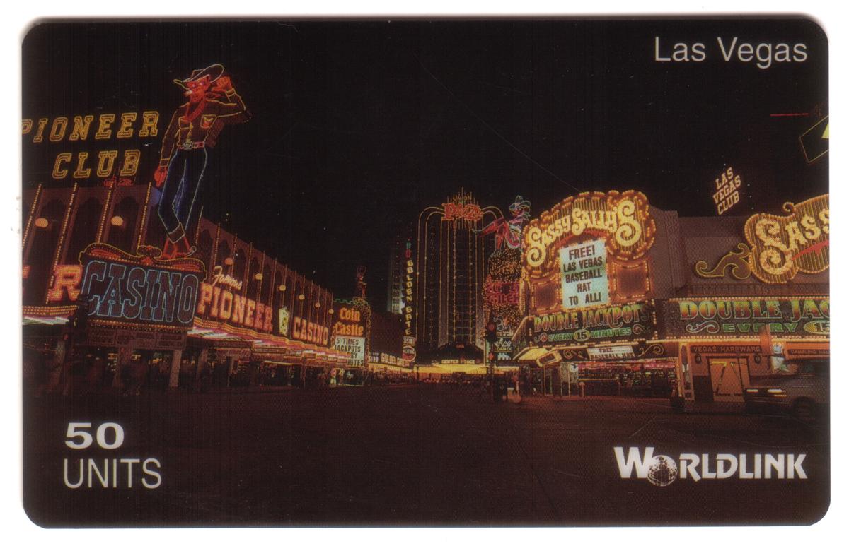 The top right corner of the card simply states "Las Vegas," while the lower-left corner shows the card’s value of 50 units. The Worldlink Communications logo appears in the lower right corner, identifying the card’s provider. The vibrant and detailed imagery captures the essence of the Fremont Street experience with its classic casinos and lively signage in Nevada’s entertainment capital.