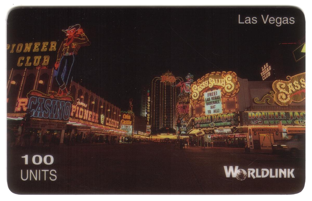 Additional text identifies “Korean Reverse - WorldLink Commun.” as part of the card’s issuing details, indicating the card’s origin or network provider. The overall layout is dominated by these names and promotional offers, clearly focused on the excitement and allure of Las Vegas casinos in the Fremont Street and Strip areas. The card’s visual elements and printed text firmly ground it in the theme of classic Las Vegas casino entertainment.