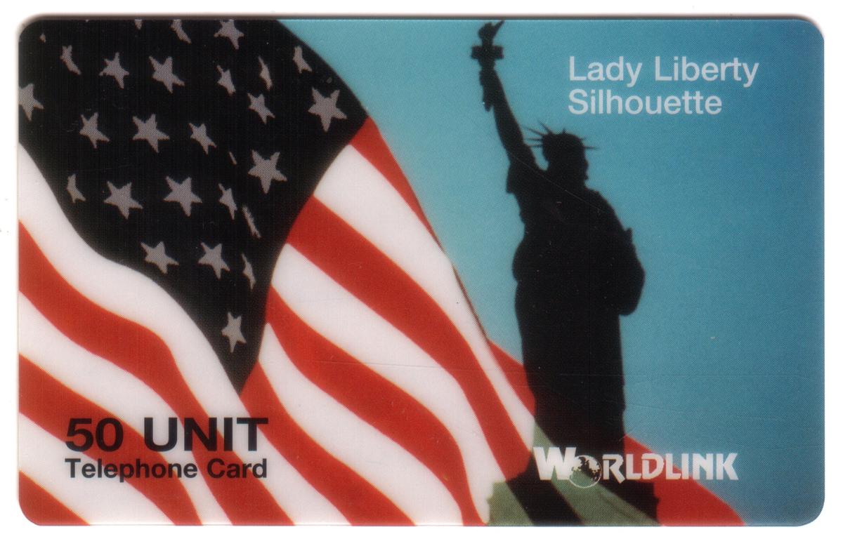 This collectible phone card features iconic American symbols set against the backdrop of New York City. The design prominently displays the Statue of Liberty in silhouette, an enduring emblem of freedom and a national monument located in New York Harbor. Alongside the statue, the image incorporates a stylized representation of the American flag with bold red and white stripes and white stars on a blue field, symbolizing the nation’s identity and patriotic spirit.