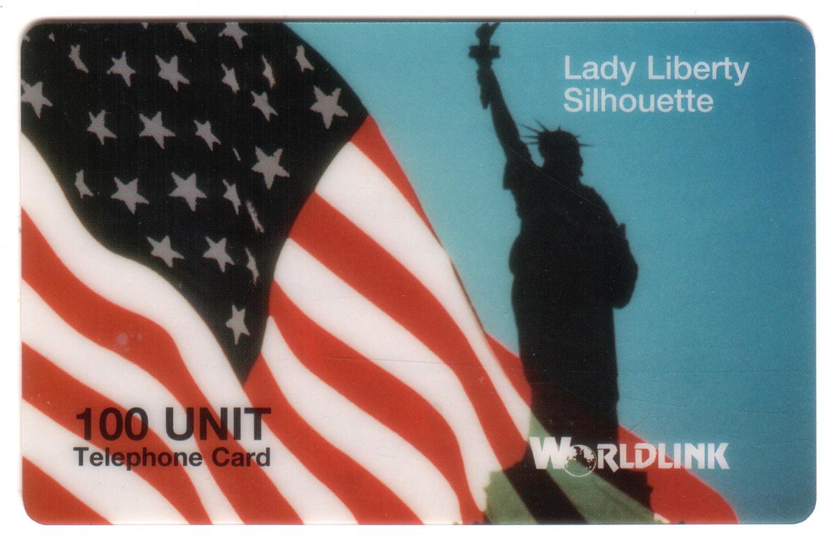 This phone card is part of the WorldLink Communication series and features a clean, organized design with the company’s logo and relevant details placed discreetly. The contrast between the dark silhouette and the vivid American flag background makes the card visually striking while honoring celebrated symbols of American heritage and identity.