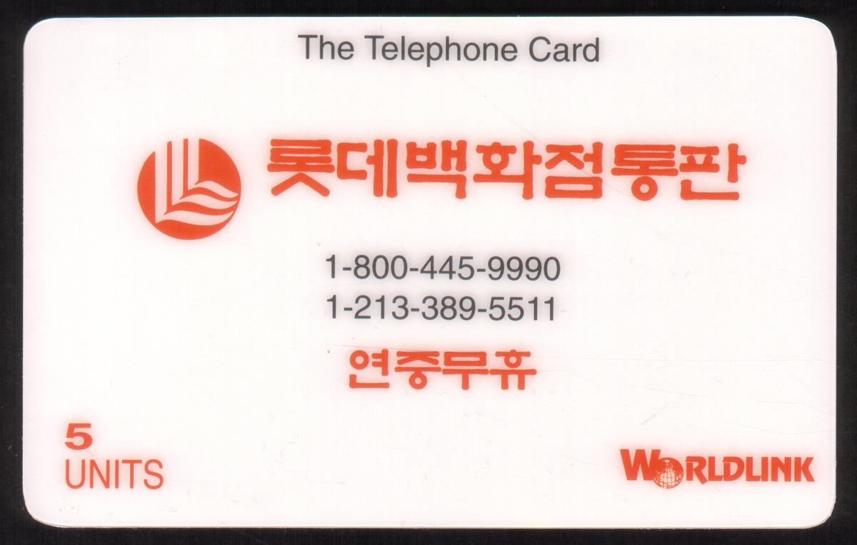 Overall, this card represents a collectible phone card linked to a major South Korean retail entity, Lotte Department Store, provided by WorldLink Communications. It serves as a promotional or collectible item connected to Lotte Shopping and its affiliates, with clear references to A-1 Trading Company in California.