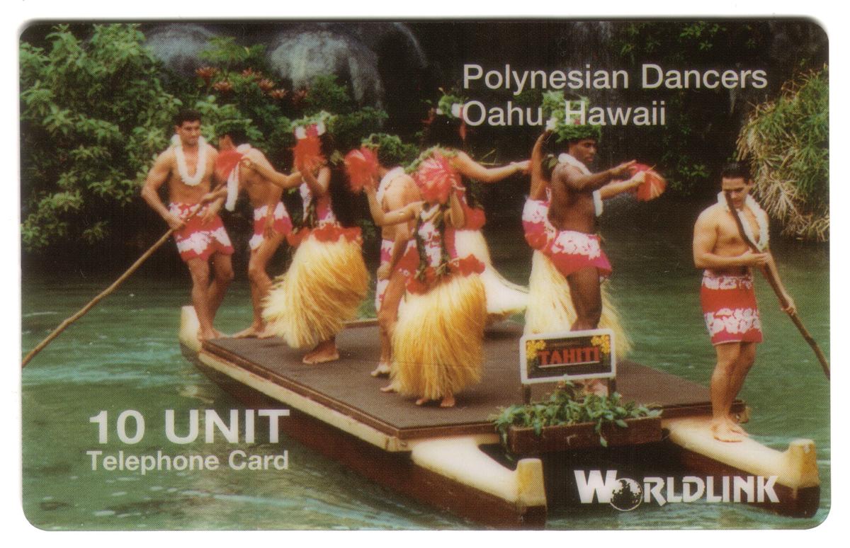 The card displays the words "Polynesian Dancers, Oahu Hawaii" prominently, identifying the location and subject of the image. The name "WorldLink Commun." appears on the card, indicating the telecommunications provider associated with the card. The overall design highlights a blend of sightseeing and cultural tradition, making it appealing to collectors interested in travel and Polynesian culture.