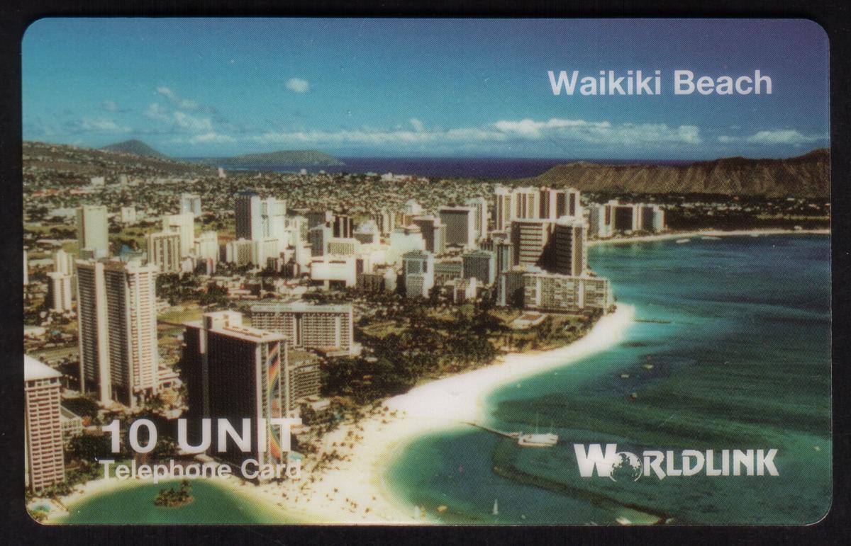 This collectible phone card features a vibrant photographic image of Waikiki Beach, Hawaii. The scene captures the iconic shoreline with its golden sand stretching alongside the calm ocean waters. Palm trees and tropical greenery are visible, enhancing the scenic, tropical atmosphere. The background prominently displays the Honolulu skyline, including multiple hotels and high-rise buildings that emphasize Waikiki’s status as a popular tourist destination.