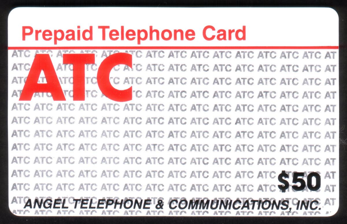 This prepaid telephone card is issued by Angel Telephone & Communications Inc. (ATC). The card features a white background with the repeating text "ATC" in light gray across the entire face. The large, bold red letters "ATC" stand out prominently near the upper left side of the card. Above the logo, the text "Prepaid Telephone Card" is displayed in red. Below the ATC logo and near the bottom right corner, the value of the card is denoted as "$50" in bold black text. At the bottom of the card, the full company name "ANGEL TELEPHONE & COMMUNICATIONS, INC." is printed in black, capital letters. The overall design is simple, clean, and focused on the corporate identity and card value.
