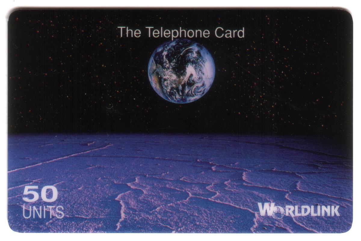 The card includes text in English, with the words "WorldLink Commun." displayed clearly, indicating the association with WorldLink Communications. The word “NASA” also appears, linking this imagery directly to the United States space agency. The design integrates these elements neatly around the circular edges of the card. The overall effect is a powerful homage to space exploration and Earth’s unique place in the cosmos.