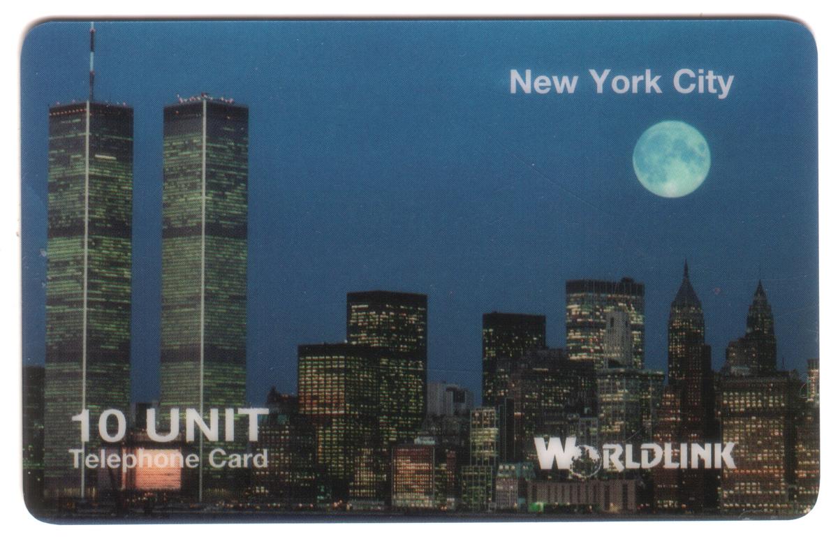 This card is part of the WorldLink Communications series and is identified as SKU-28120, highlighting a famous international city with a scenic, travel, and sightseeing theme focused on New York City. The image captures some of the city’s iconic architecture during nighttime, emphasizing the recognizable twin towers before their destruction.