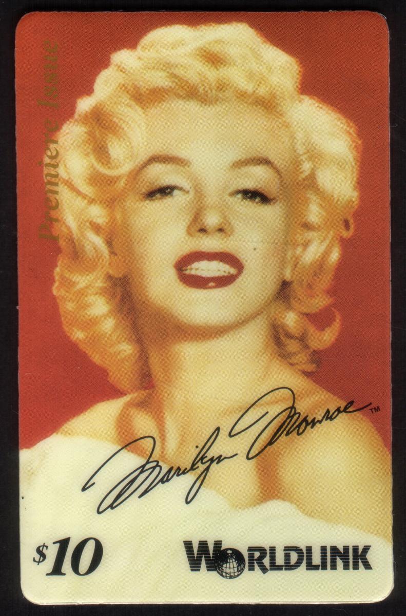 All cards prominently display Marilyn Monroe’s autograph in a stylized signature and the "$10" value. The text "Premier Issue" appears on at least two cards, indicating their release status. These phone cards were produced by WorldLink Communications, highlighting Marilyn Monroe’s status as a celebrated Hollywood movie star and cultural icon.