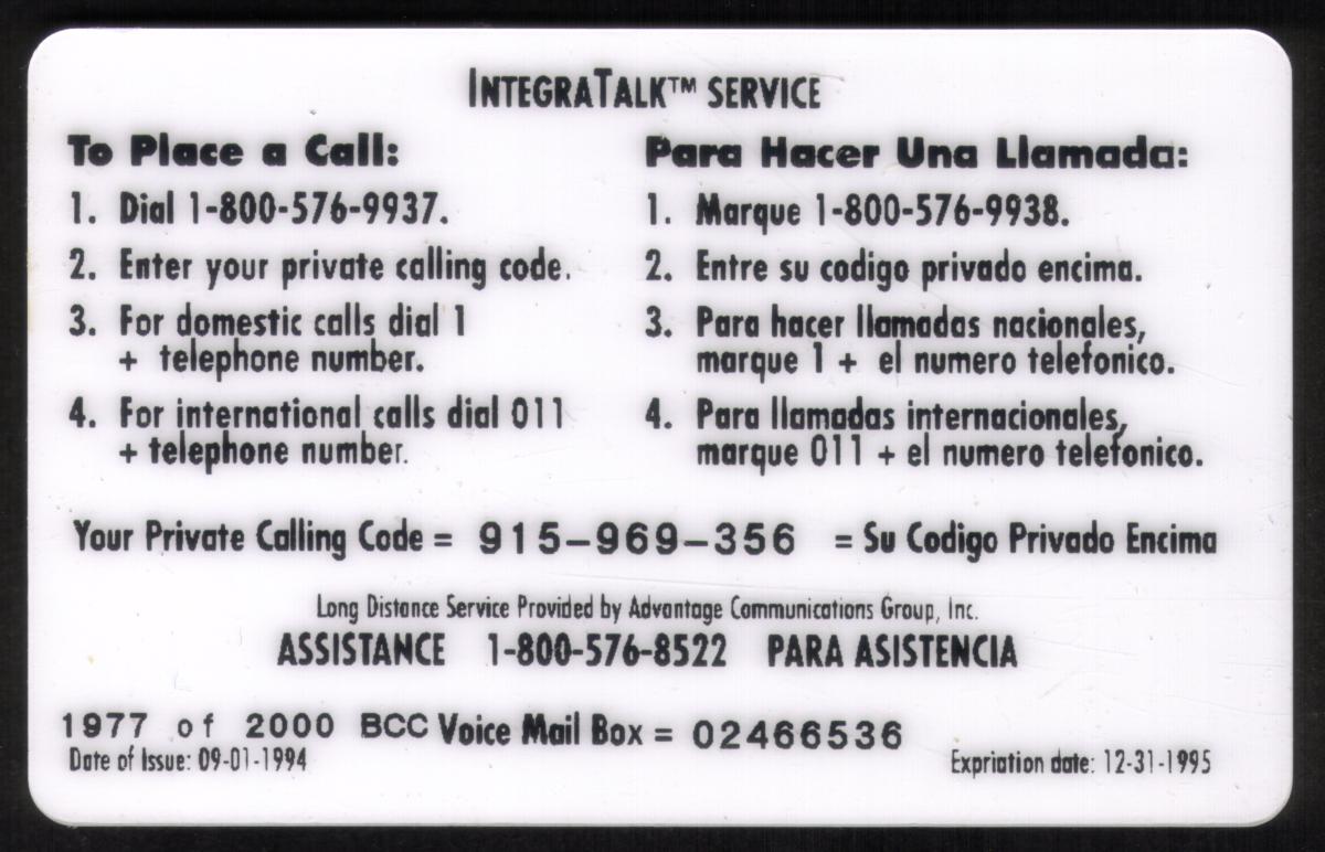 Keywords linked to this card include travel, sightseeing, Advantage Communications Group, integratalk, Integrity Telecom, and WorldCom, indicating associations with telecommunications services. The card is identified as part of the Advantage Card series by ACG (Advantage Communications Group), intended for communication purposes.