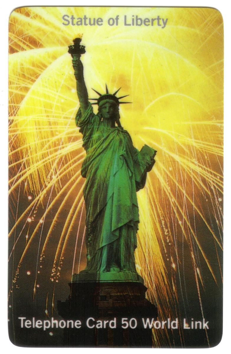 Statue of Liberty with fireworks, patriotic design, 50 World Link value, ideal for international calls, collectible landmark-themed phone card. |