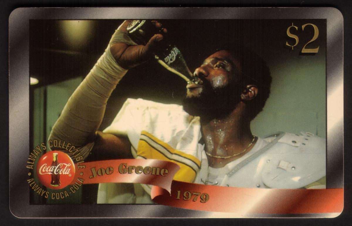 This collectible card features a vivid image of Joe Greene, a former professional football player. Joe Greene is depicted holding and drinking from a bottle of Coca-Cola. The card prominently displays various Coca-Cola logos, emphasizing the brand’s presence. The card is marked as Coca-Cola '96 $2 and is part of The Score Board Inc. collection. It is noted as Joe Greene (1979) Coke Card #1 of 48 (Gold Edition).