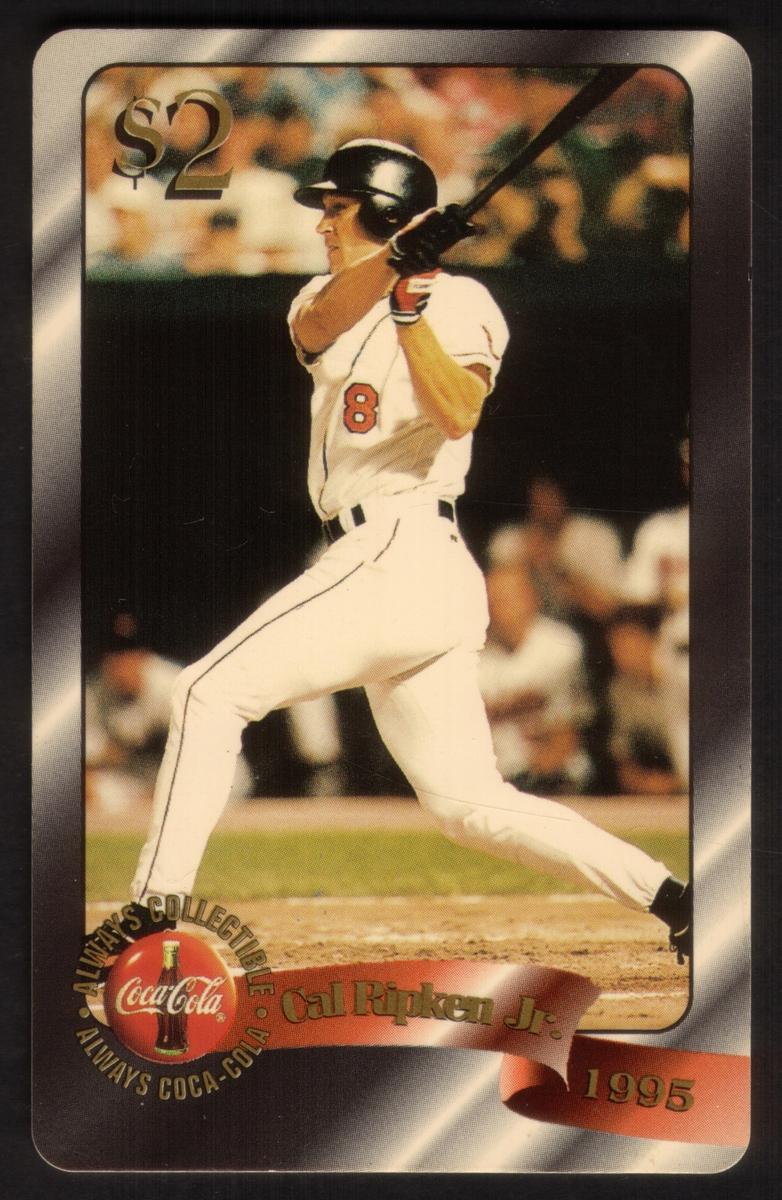 Cal Ripken Jr. is shown wearing a baseball uniform and holding a wooden baseball bat, captured mid-action as he prepares to bat. The background features a baseball field setting, but the exact stadium or location is not specified. The card's visual elements combine sports imagery with the iconic red and white Coca-Cola color scheme, emphasizing the marketing partnership between Major League Baseball and the Coca-Cola brand during that era.