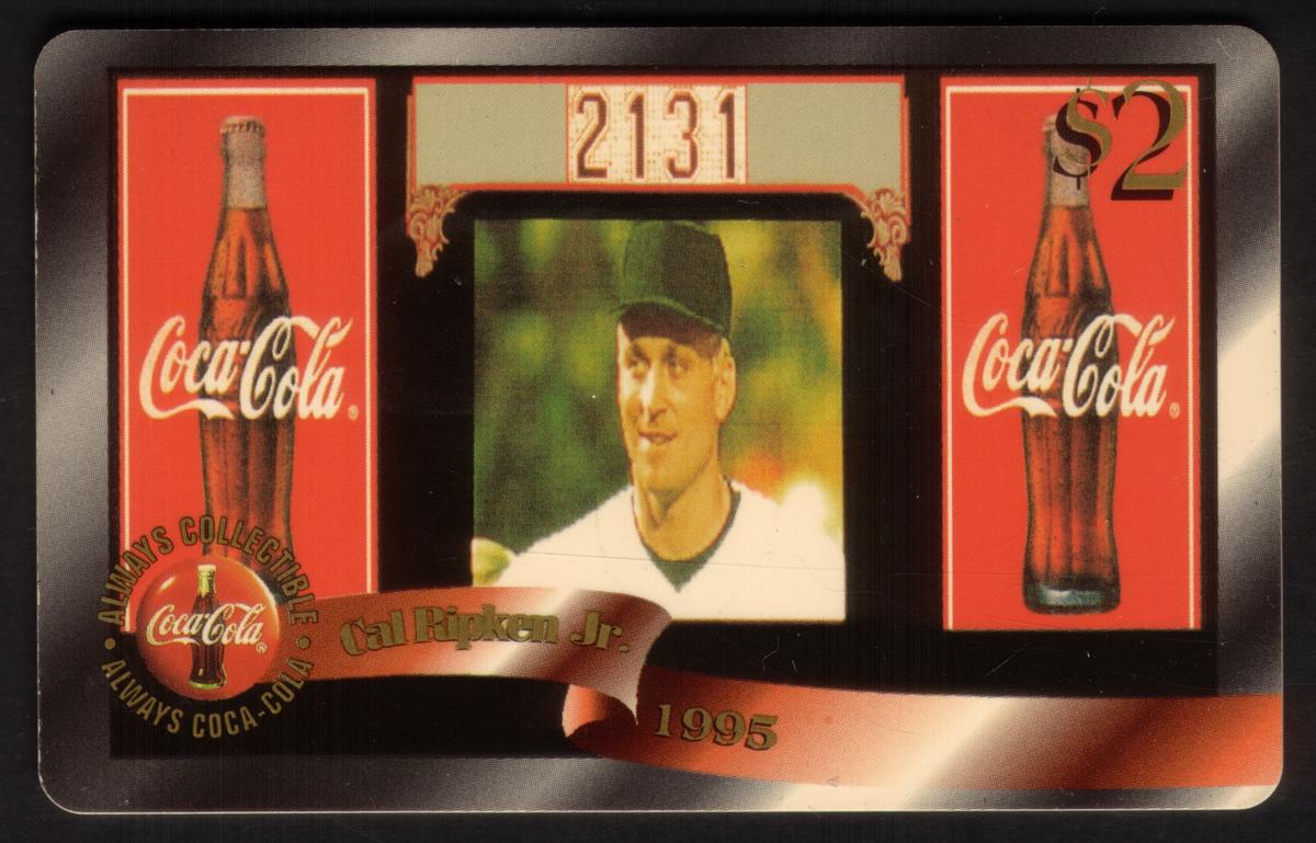The overall design includes baseball-related elements such as baseball bats and baseballs, emphasizing the sports theme. The combination of Cal Ripken’s image, Coca-Cola branding, and baseball motifs highlights the collectible nature of this card within the intersection of sports memorabilia and branded promotional items.