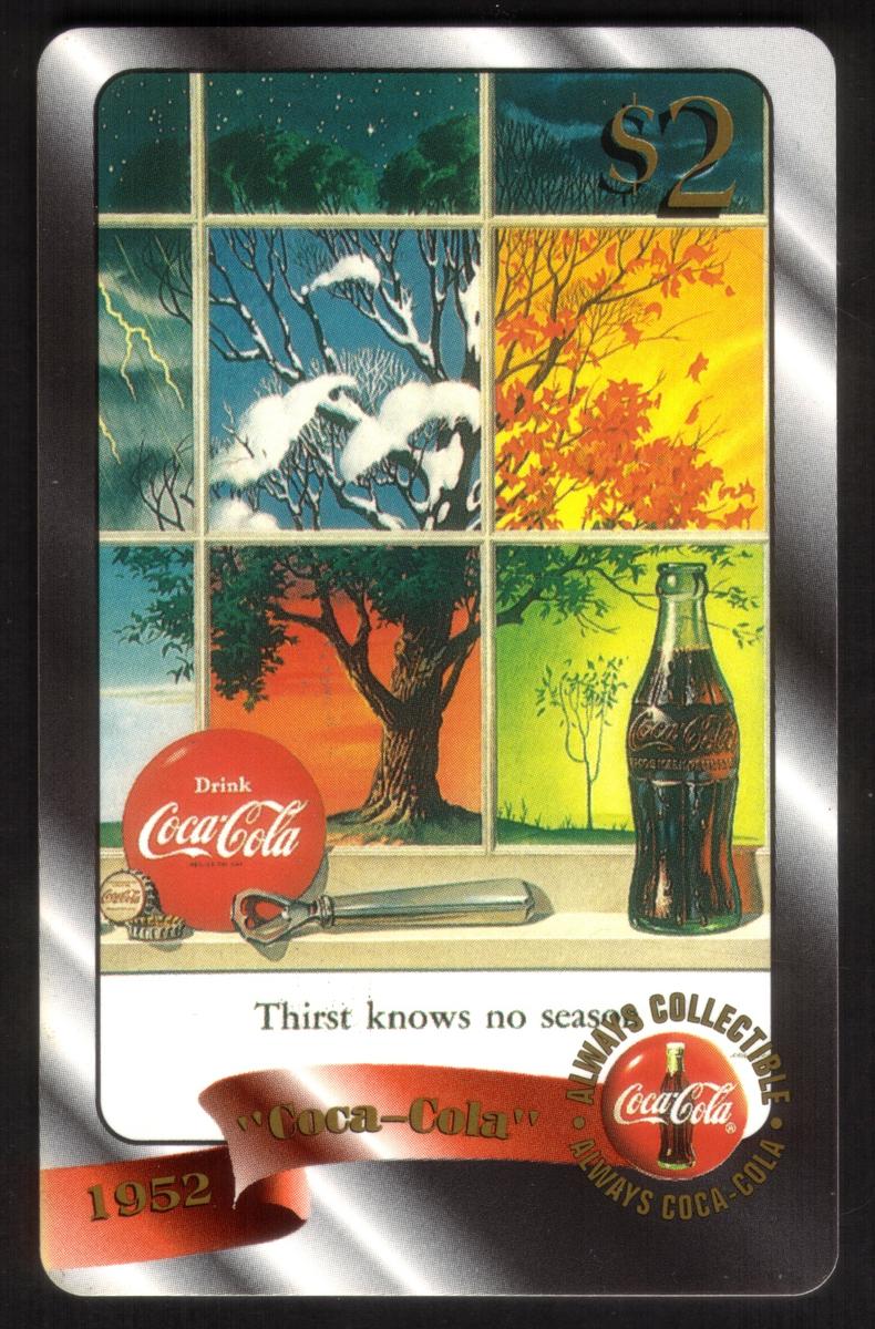 This collectible Coca-Cola card features several classic Coca-Cola logos prominently displayed. The design includes multiple variations of the Coca-Cola script logo, a red Coca-Cola bottle, and a metal bottle opener with the Coca-Cola branding. The phrase "Coca-Cola '96 $2" appears in bold, referencing the year and value associated with the card. The card is identified as number 23 out of a 48-card set titled "Coke In All Seasons (1952)" produced by The Score Board Inc.