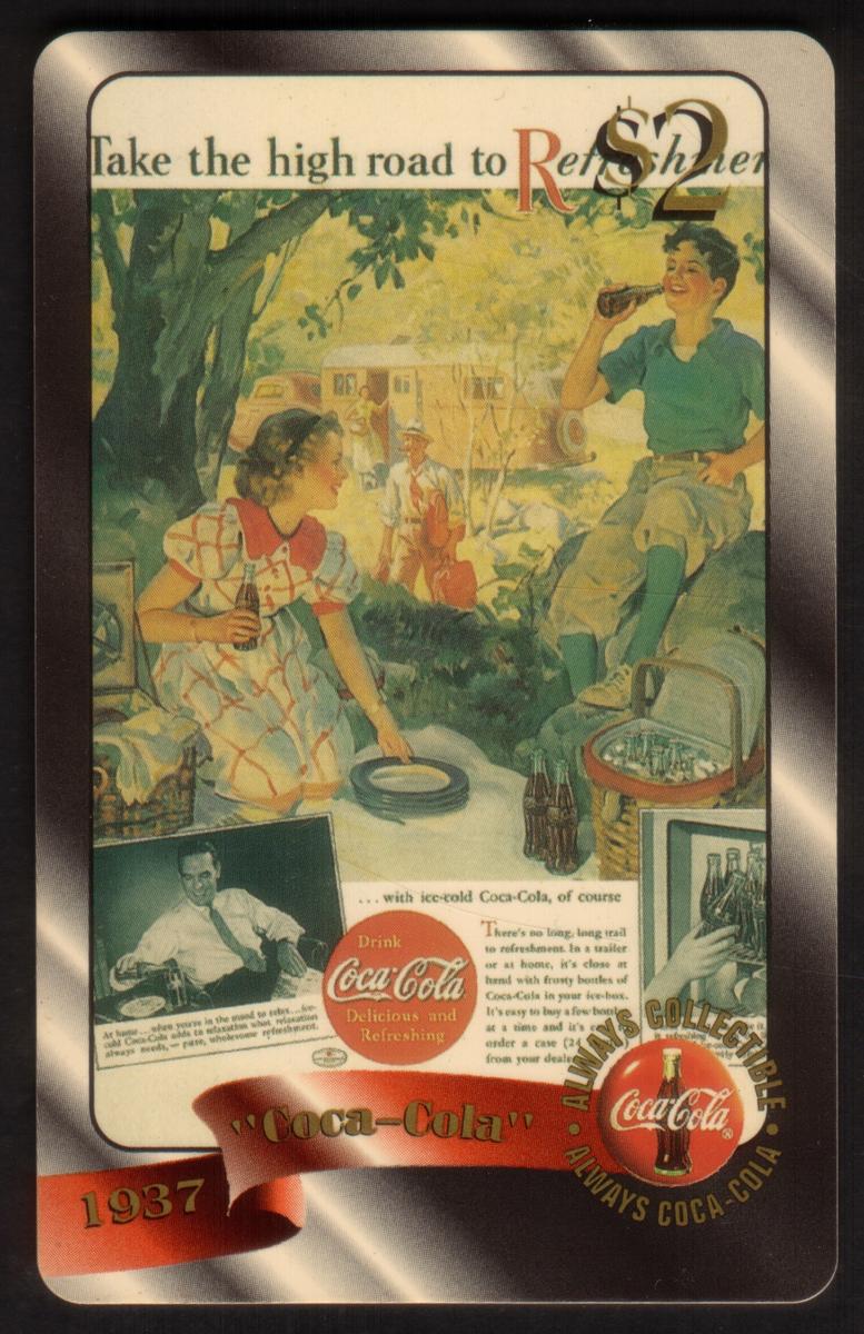 Overall, the phone card celebrates the Coca-Cola brand with vibrant images of the popular beverage bottles and a refreshing slogan, making it a distinct item for collectors interested in Coke memorabilia from 1996.