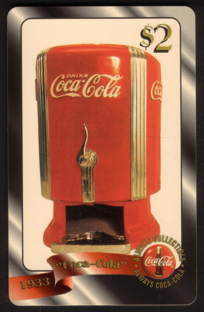 This collectible card features the Coca-Cola 1996 $2 Fountain Dispenser design, part of The Score Board Inc. series. It is card number 39 of 48 in this Gold set. The front of the card prominently displays vintage Coca-Cola logos in classic red and white colors. The main visual element is a detailed image of a 1933 Coca-Cola fountain dispenser, showcasing the iconic Coke branding and design typical of the era. The overall presentation highlights the historical and nostalgic aspects of Coca-Cola’s classic drink dispensers.