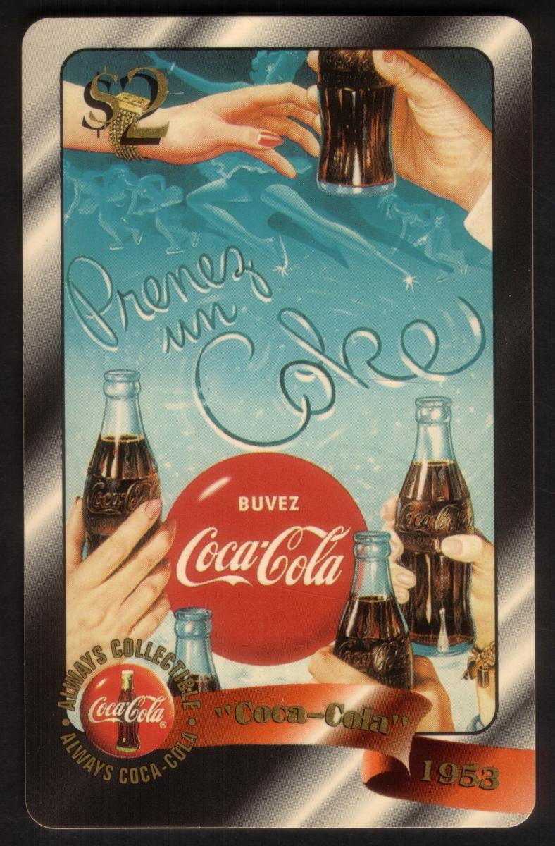 This collectible phone card features prominent Coca-Cola branding, including multiple Coca-Cola logos and the phrase “prenez un coke, buvez coca-cola,” which is French for “take a Coke, drink Coca-Cola.” The design prominently displays the iconic Coca-Cola script logo, reinforcing the classic branding associated with the company.