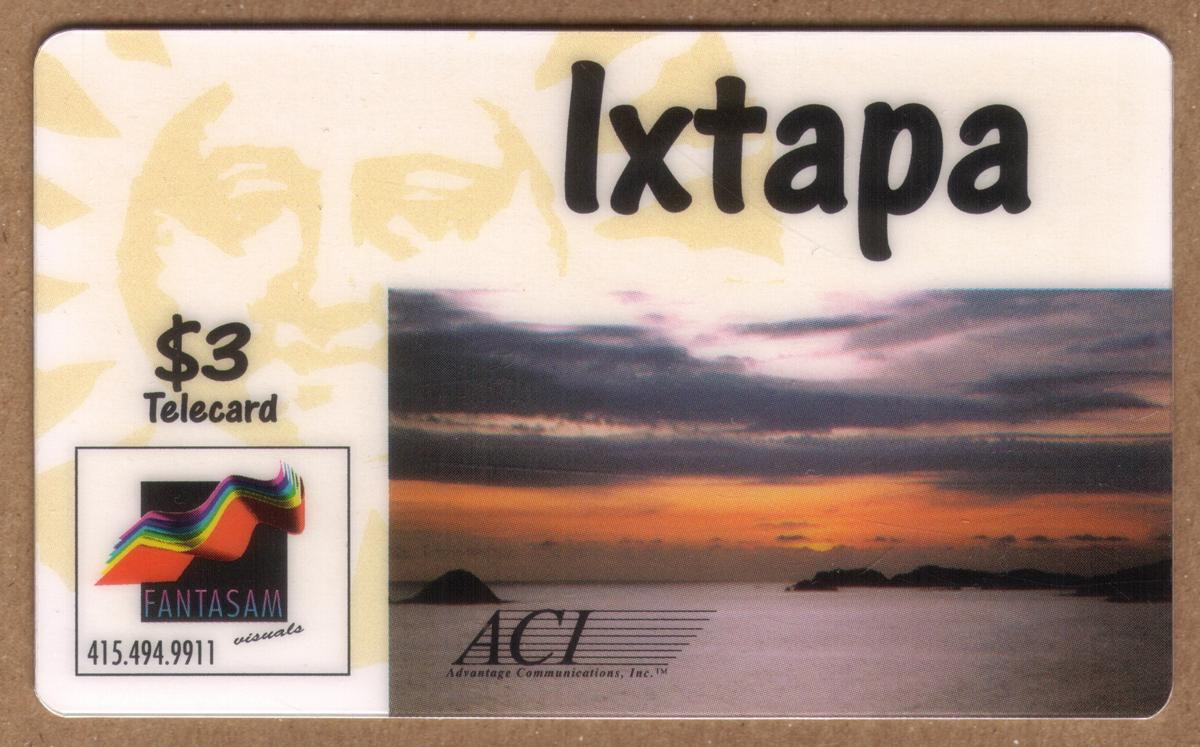 The front of the card includes the text "Ixtapa Mexico Sunset" along with the denomination "$3" prominently displayed. The card also features the ACMI logo, indicating it is part of a series or issue by this organization. The overall design emphasizes travel and scenic beauty, showcasing a tranquil moment at a well-known Mexican coastal destination.