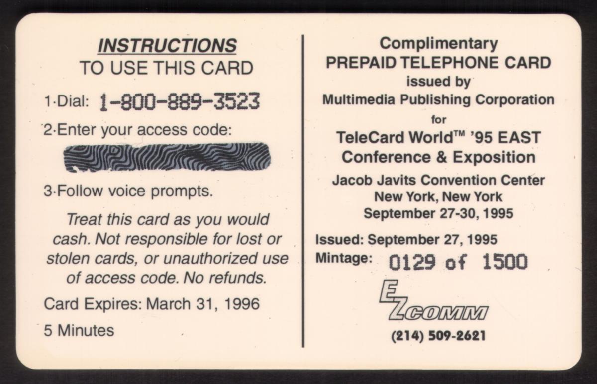 5m TeleCard World '95 East Show Card (09/95) Javitz Center, New York