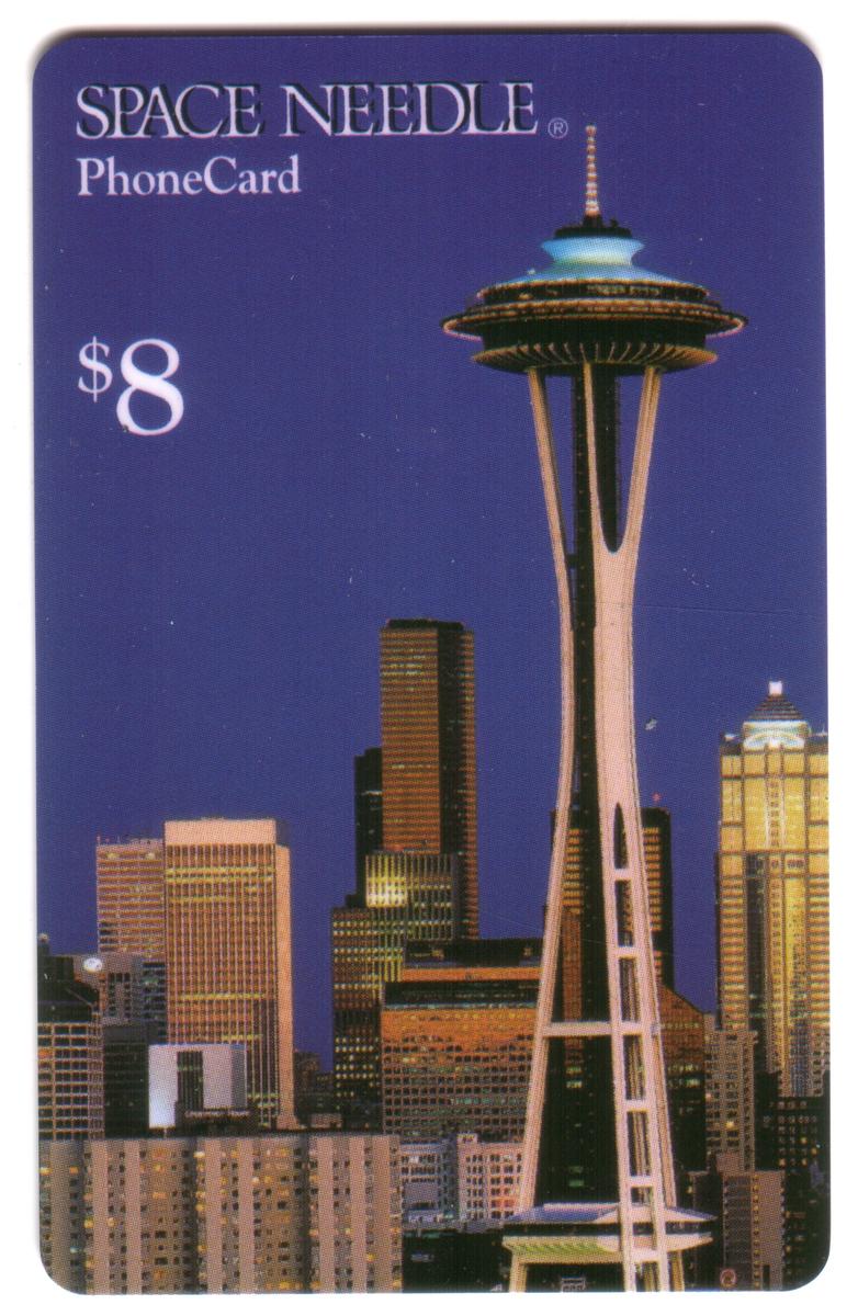 This collectible phone card features a prominent image of the Space Needle located in Seattle, Washington. The Space Needle stands tall in the center of the card, showcasing its distinct saucer-shaped observation deck and slender, tapering support structure. Surrounding the Space Needle are several buildings from the Seattle skyline, capturing elements of the city's architecture. The sky is clear, providing a vibrant backdrop to this iconic landmark.