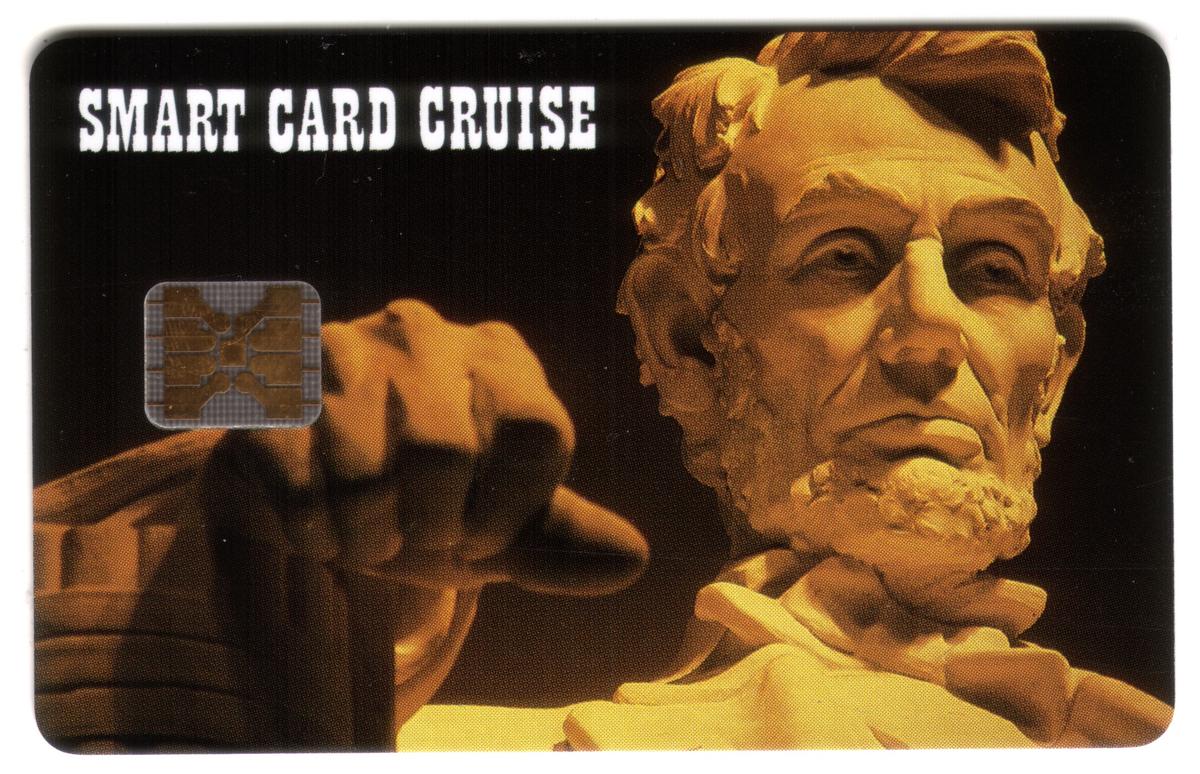 The overall design combines historical significance with technological function, linking President Lincoln with the 1990 conference hosted in Washington D.C. This card also serves as a show card, highlighting its collectible and commemorative nature connected to the cruise conference event coordinated by Schlumberger and Comsat.