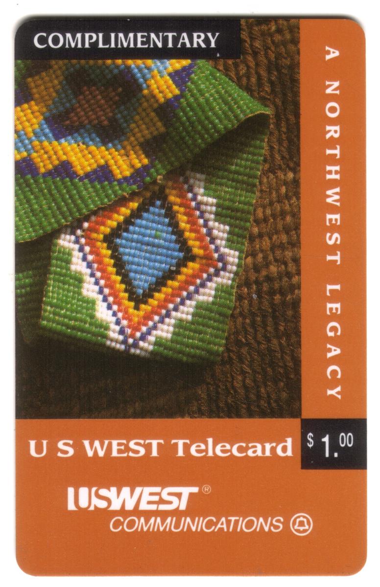Northwest Native beaded textile design phone card featuring Indigenous craftsmanship, U S WEST branding, $1.00 value, with functional magnetic strip and usage details. |