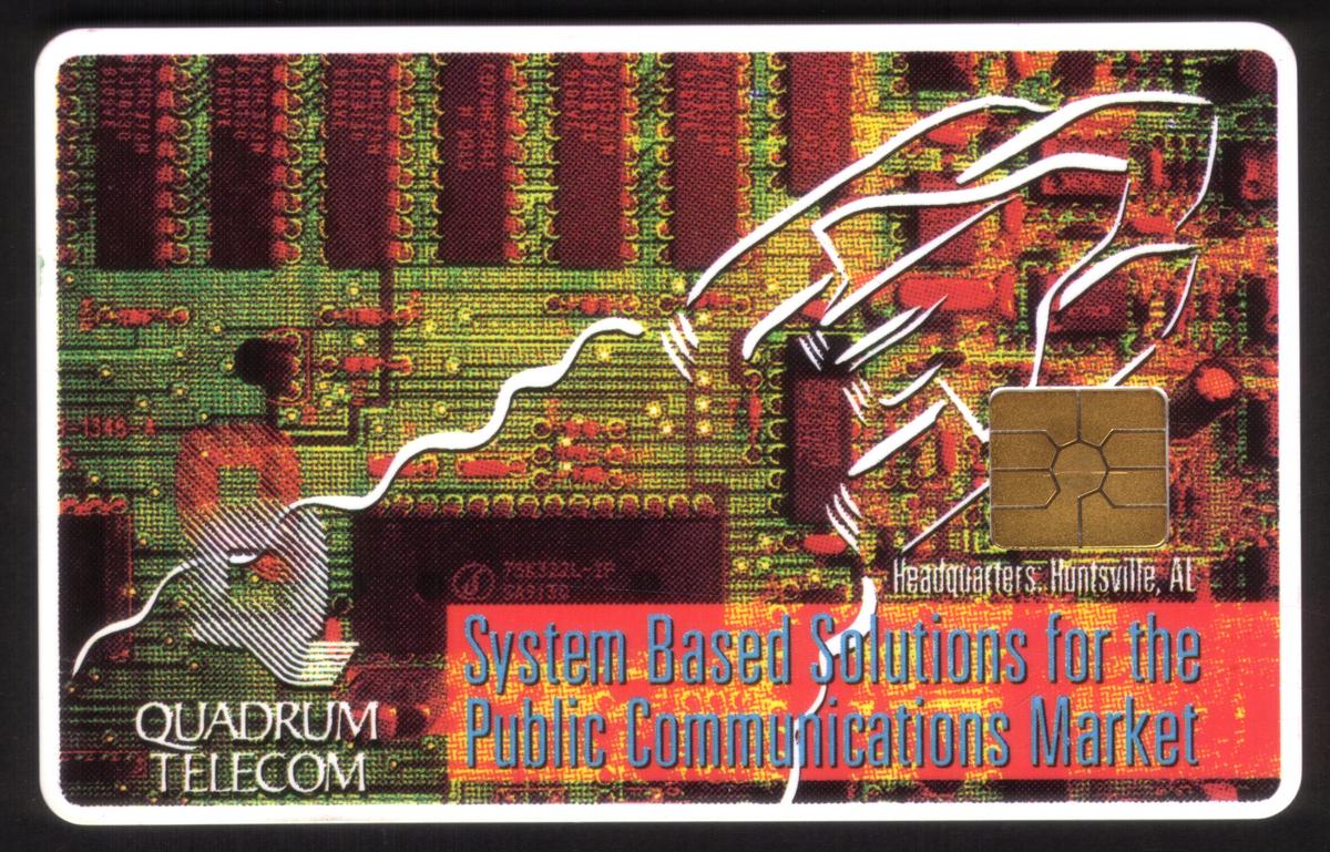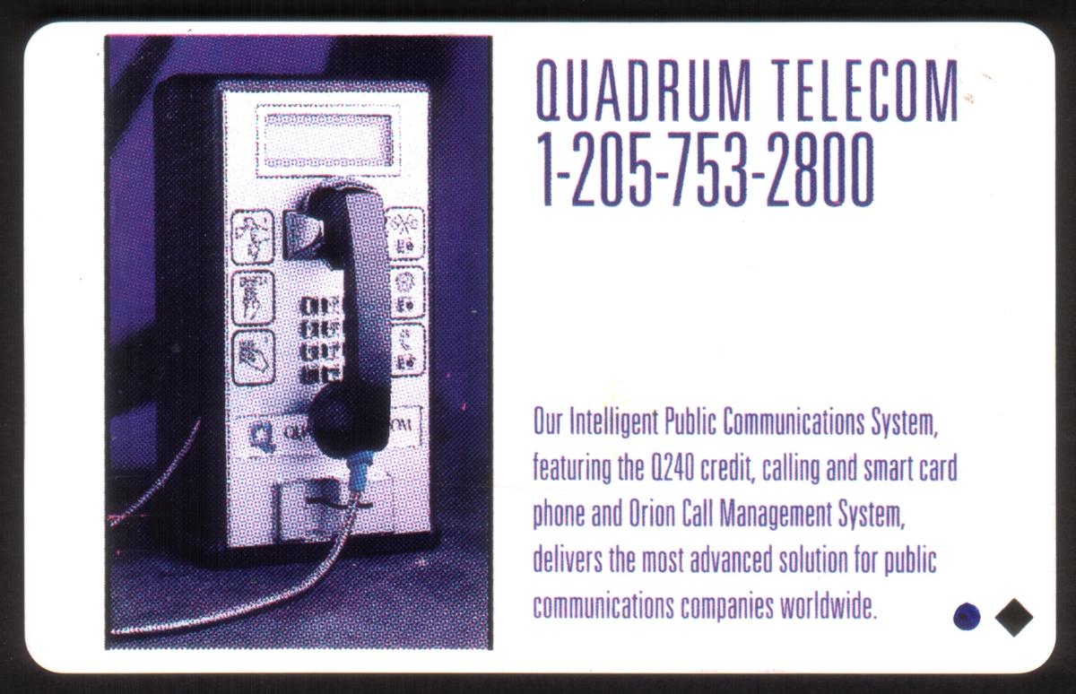This card is part of Quadrum Telecom's offerings, associated with chip stored value technology and smart card systems, incorporating the Orion Call Management System for public communications. The design reflects the connection between telecommunications infrastructure and advanced aerospace technology, combining visual elements from both industries.
