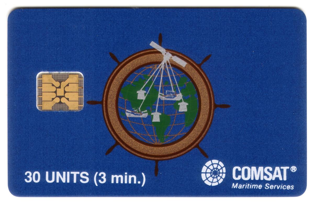 In the lower-left corner, the card displays the value information: "30 UNITS (3 min.)", indicating available service units for usage, possibly measured in minutes. The lower right corner shows the COMSAT logo and the text "COMSAT Maritime Services," highlighting the card’s affiliation with COMSAT’s maritime telecommunications service provider. This card supports stored value and smart card functions, suitable for use aboard ships communicating via satellite systems. The imagery and text emphasize marine communication, combining the ocean, satellite technology, and telephony into a unified design.