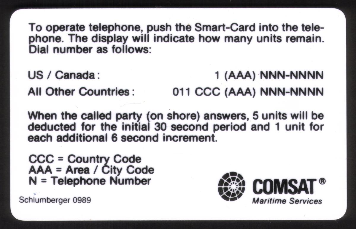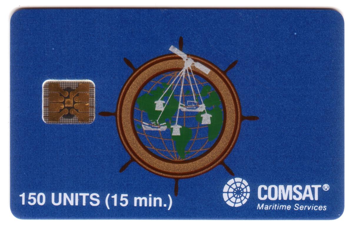 This stored value smart card is designed for use in COMSAT mobile communications, particularly for maritime settings, as indicated by the maritime services branding and ship wheel graphic. The combination of telephones and globe imagery highlights its connection to worldwide satellite telephony, intended for ship-to-shore communication.