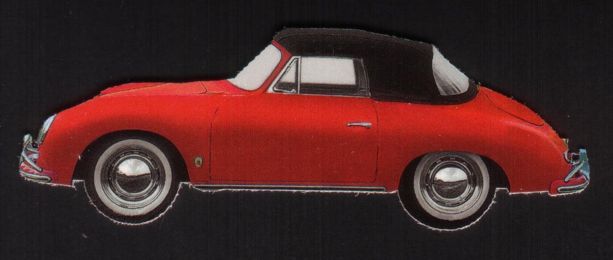 This collectible die-cut card features a red Porsche 356 sports car. The car is shown in profile facing left, with a classic curved body design, chrome hubcaps, and a black soft convertible top. The window frames and door handle are detailed in silver. The image is set against a black background, highlighting the vibrant red paint of the car.