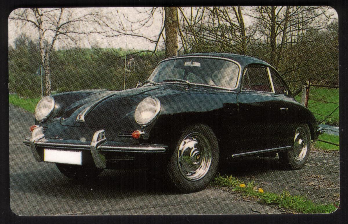 The third card depicts a black Porsche 356 parked on a paved surface next to a grassy area lined with trees. Notable features include the vehicle’s rounded front fenders, chrome bumper, and side mirrors. The natural setting with leafless trees adds a nostalgic atmosphere to the image.