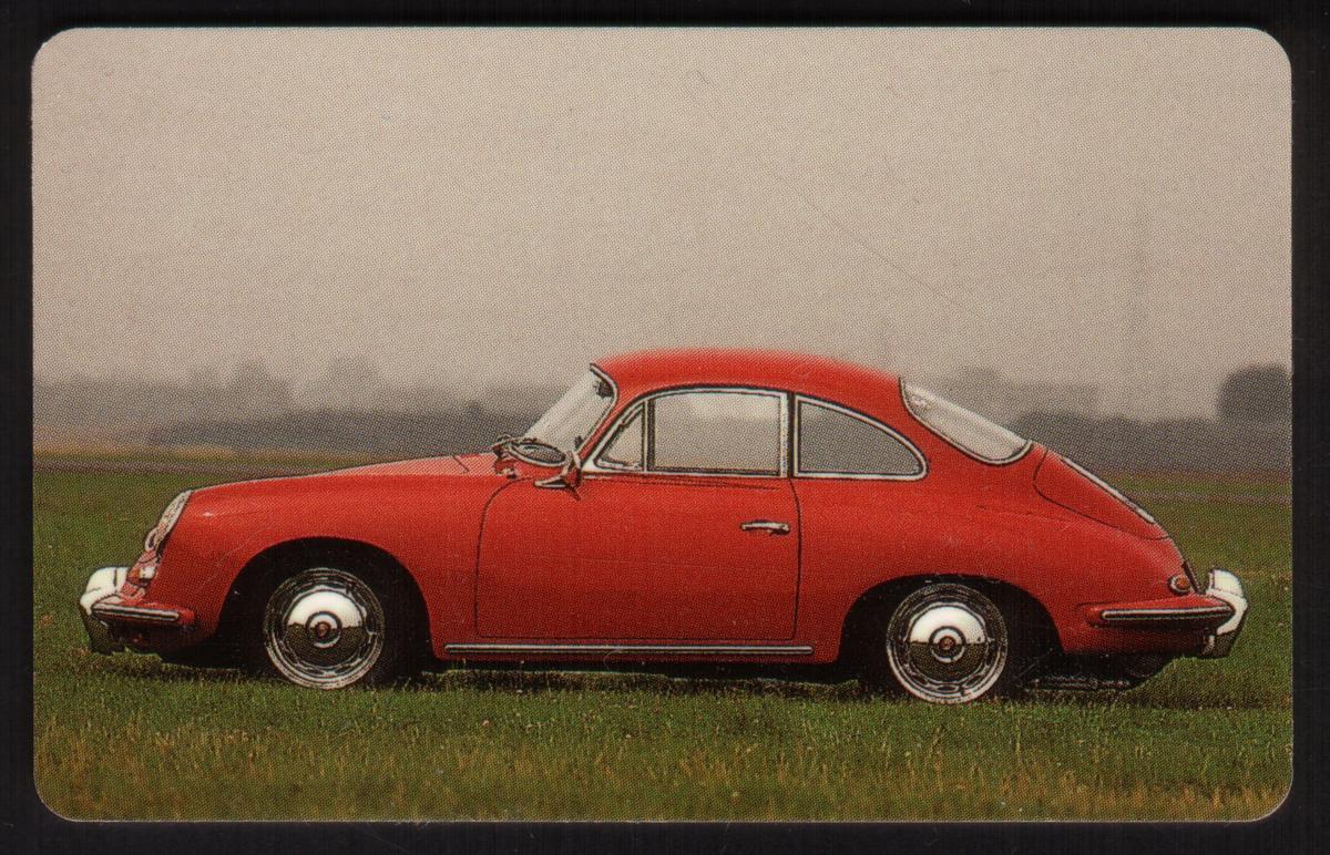 These collectible chip cards feature classic Porsche 356 sports cars in various colors and settings. The first card showcases a side profile of a red Porsche 356 situated on a grassy field with a misty overcast background. The car's smooth, iconic curves and chrome hubcaps are clearly visible, emphasizing the vehicle’s timeless design.