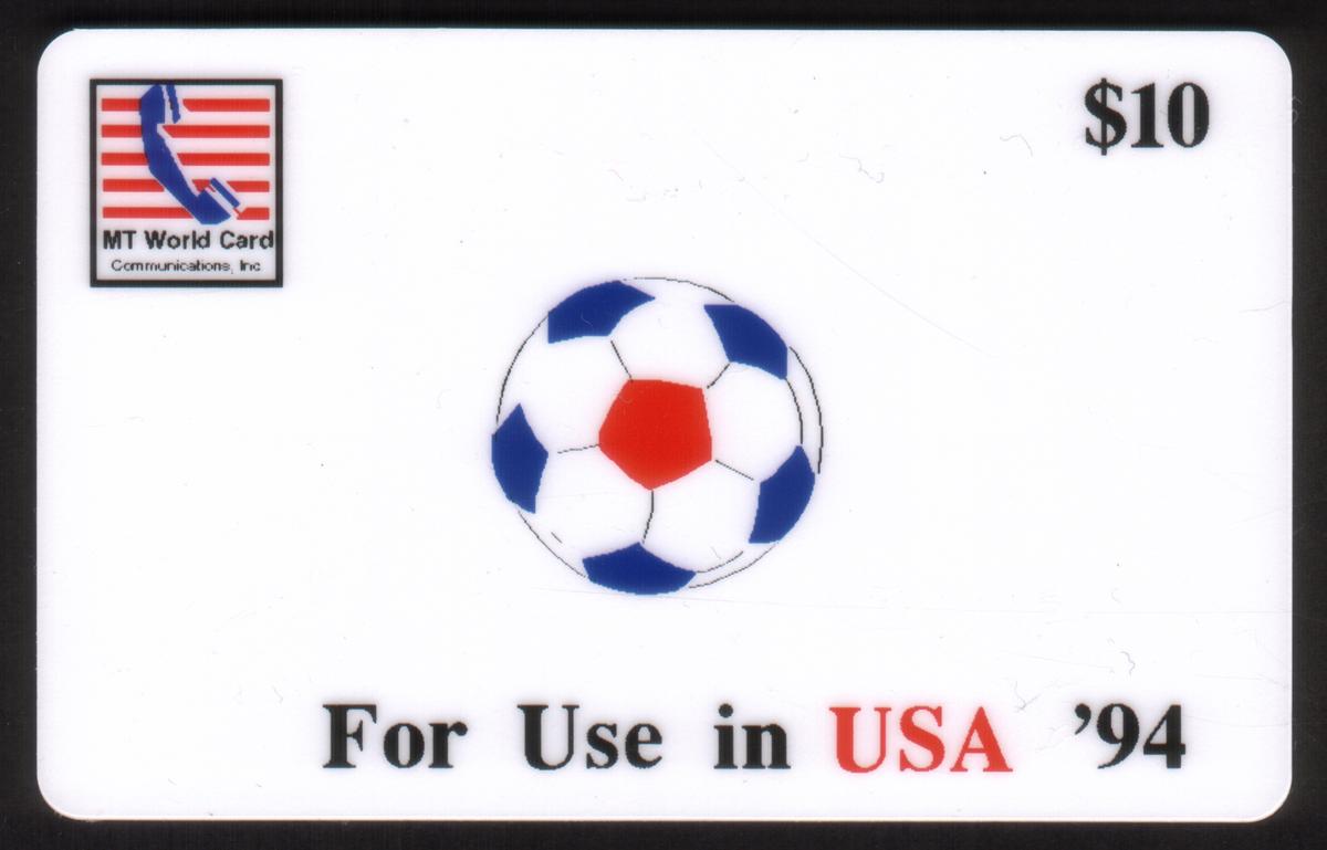 This collectible card features a detailed depiction of a classic soccer ball designed for the 1994 FIFA World Cup held in the United States. The soccer ball shown has a distinctive pattern with a combination of white and black panels creating a unique artistic design. The card clearly indicates "$10" as its value. Text on the card includes the phrase "Soccer Ball 'For Use in USA '94'," emphasizing its connection to the 1994 World Cup event. The sender or issuer of the card is "MT World Card Commun.," which is printed on the lower portion of the card.