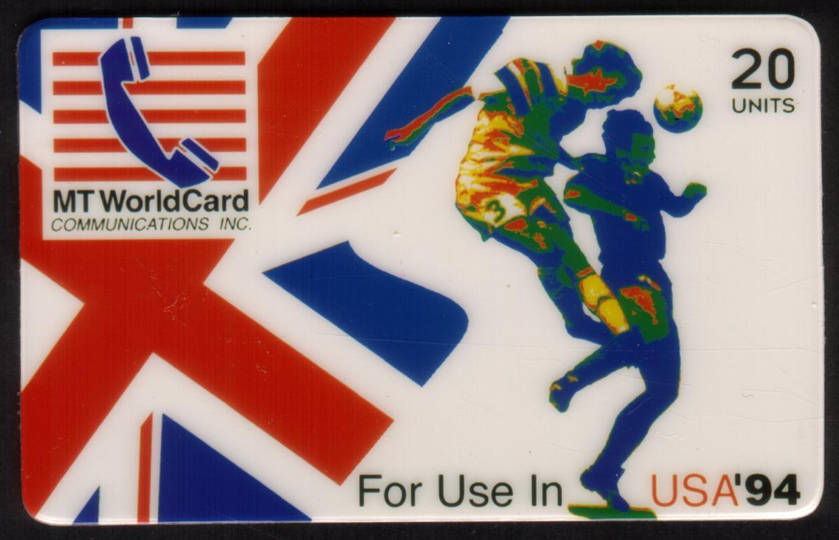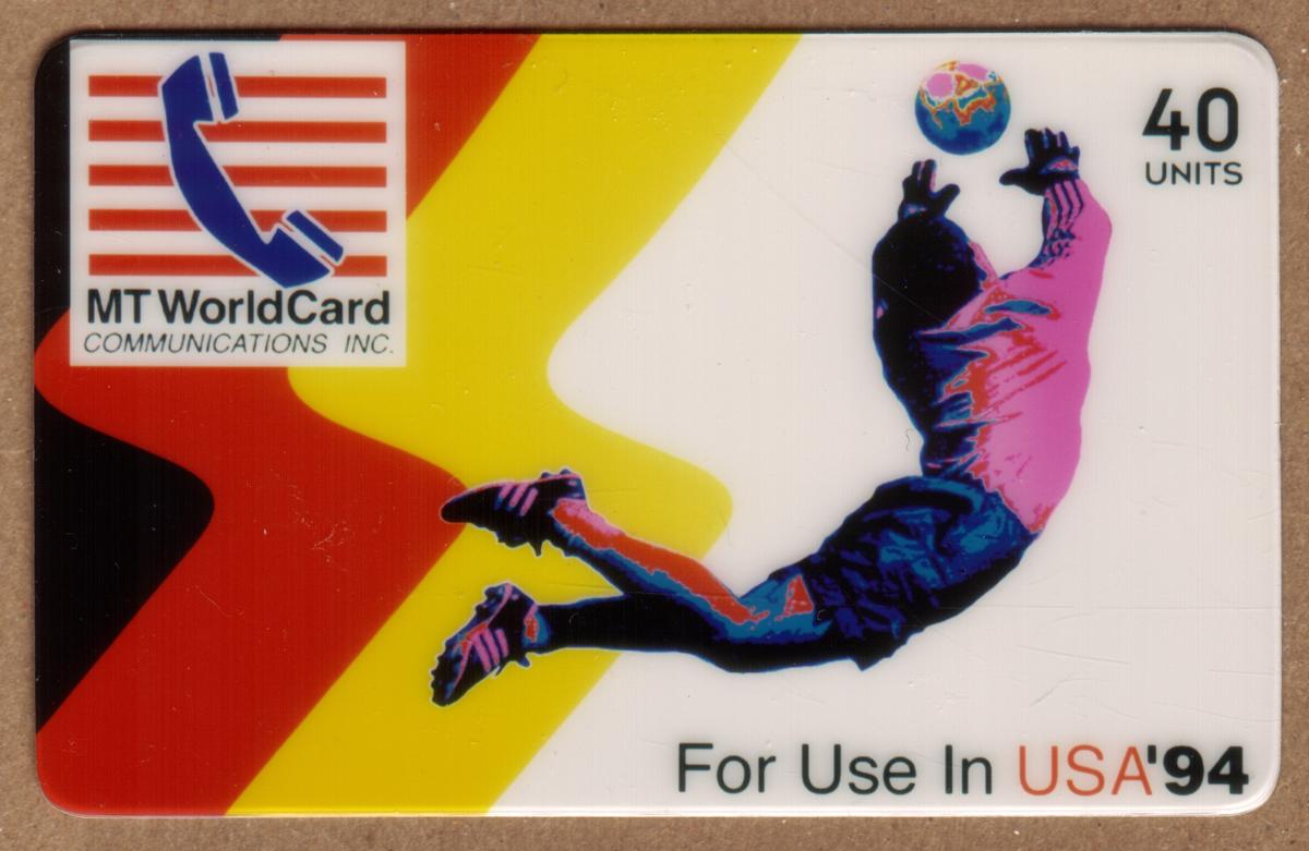 This is a complete set of five collectible phone cards from MT WorldCard Communications Inc., themed around the 1994 USA World Cup Soccer event. Each card features a vibrant artistic rendering of soccer players in action, combined with the respective national flag’s colors in the background. The cards have unit values ranging from 10 to 50 and clearly state "For Use In USA '94."