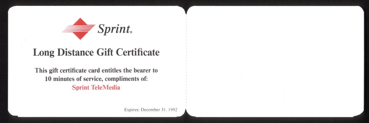 This promotional Sprint TeleMedia Long Distance Gift Certificate card entitles the bearer to 10 minutes of service. The card prominently features the Sprint logo at the top, followed by the text “Long Distance Gift Certificate.” Below this, it states that the certificate grants 10 minutes of service, courtesy of Sprint TeleMedia. The expiration date of the gift certificate is printed at the bottom as December 31, 1992.