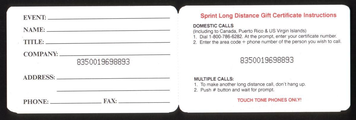 The design is clean and straightforward, using clear black and red text on a white background. The words “Sprint” and “TeleMedia” are distinguished by their use of red color, emphasizing the service provider. The card’s size and layout align with typical promotional certificate cards issued by telecommunications companies during this time period.