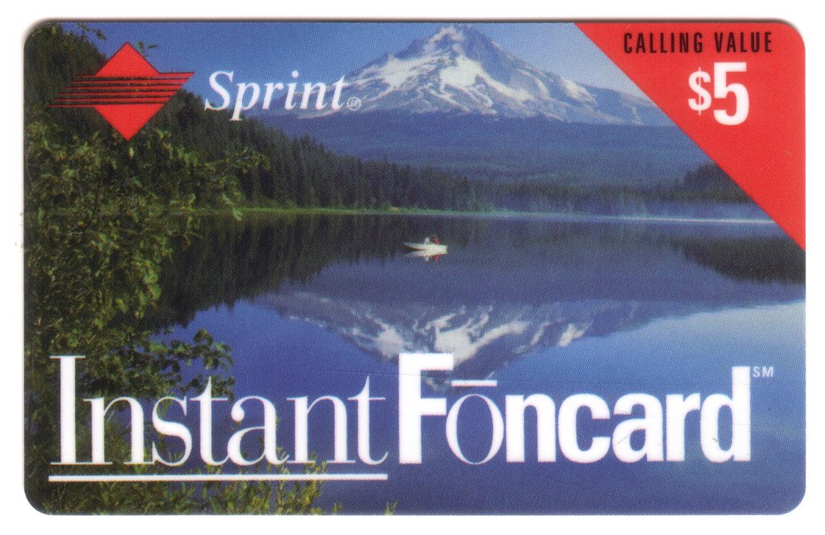 Overall, this card captures a peaceful mountain lake vista with a focus on nature and tranquility, featuring clear branding by Sprint and a $5 calling value.