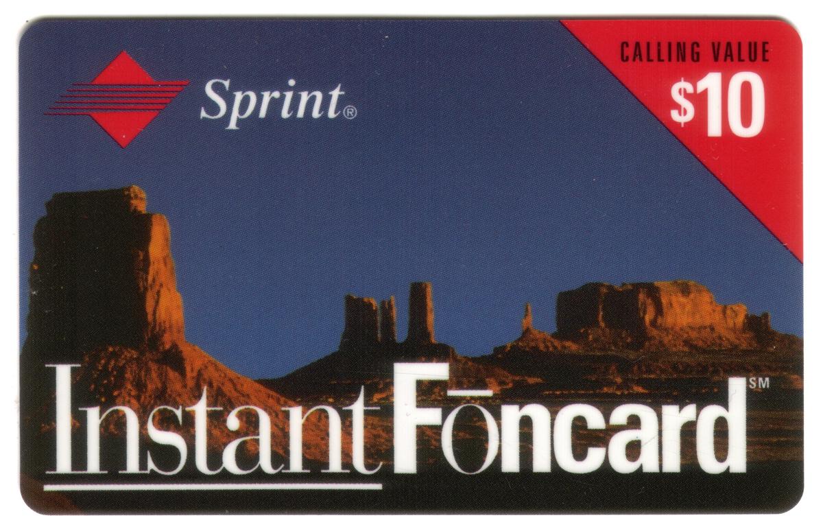 The card is issued by Sprint and prominently displays the Sprint logo in the upper left corner. In the upper right corner, a red triangular section marks the calling value of $10 in bold white text. The name "Instant Foncard" is printed across the lower portion of the card in large white letters with a modern font style.