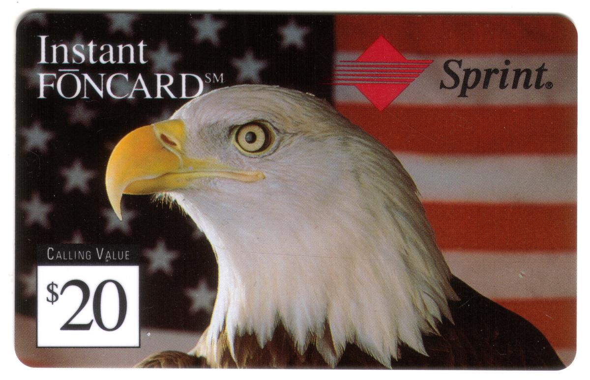 This collectible phone card features an image of an American Bald Eagle, a powerful symbol of the United States and its national emblem. The eagle is portrayed prominently, highlighting its distinctive white head and dark brown body feathers, signifying strength and freedom. The background complements the bird with natural elements, enhancing the theme of American wildlife and its endangered species. The wording on the card includes “$20,” indicating its value, and “Instant Foncard” along with “Sprint,” showing the card’s service provider and type.