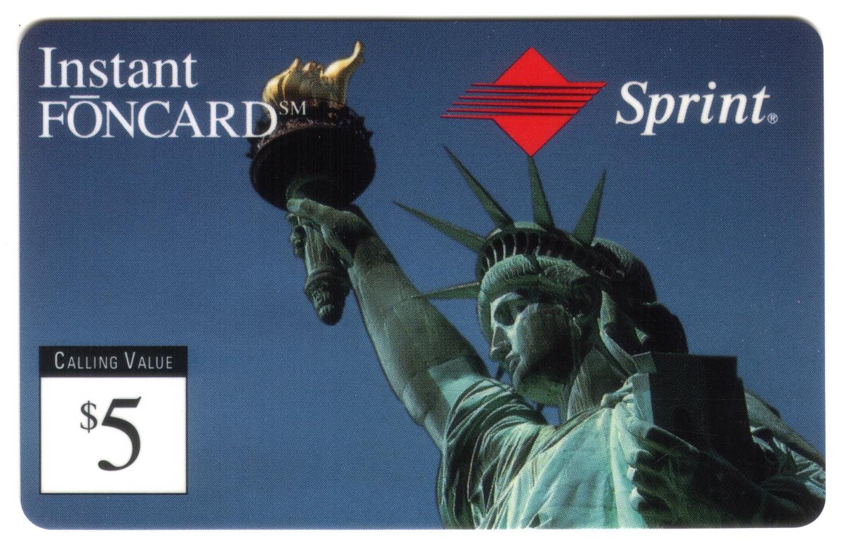 The card includes text indicating it is an "Instant Foncard" with a $5 value, linked to Sprint telecommunications services. The expiration date printed on the card is July 31, 1995. The words “Statue of Liberty” appear near the central image, confirming the subject. The card also features the WorldCom logo near the top left corner, associating it with the global communications provider WorldCom.