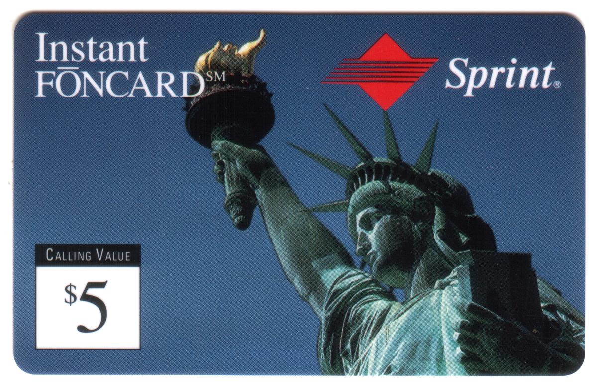 The card is valued at $5, and the text includes "Instant Foncard" along with an expiration date of 04/30/95 and the Sprint logo, indicating the telecommunications provider associated with this card. The visual presentation focuses on American historical sights and landmarks, emphasizing the importance of the Statue of Liberty as an enduring symbol of freedom and American heritage.