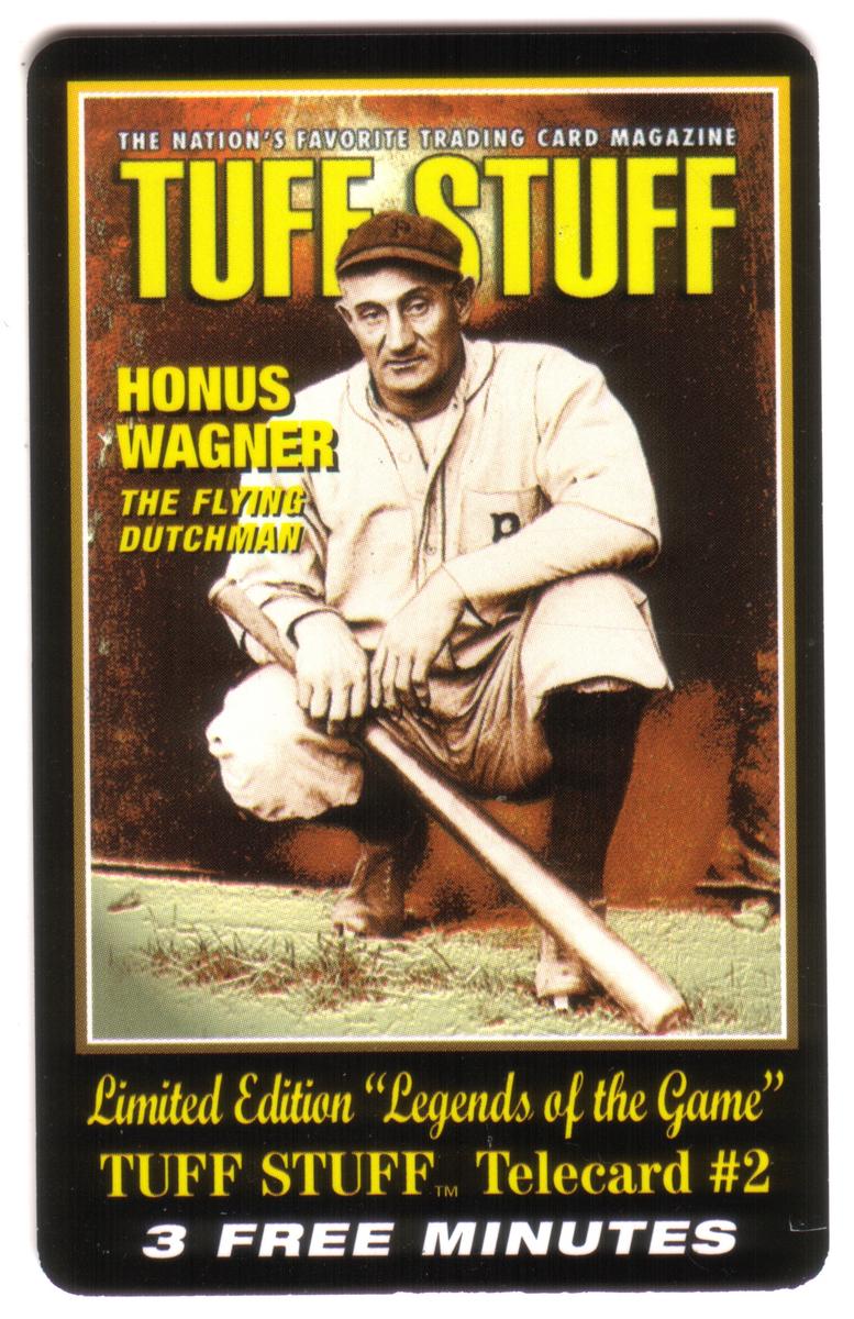 The card is branded with "TUFF STUFF" in large yellow letters at the top, identified as "The Nation's Favorite Trading Card Magazine." Below Wagner's image, text reads “Honus Wagner The Flying Dutchman,” emphasizing his nickname and iconic status in baseball history. Further down, it states “Limited Edition ‘Legends of the Game’” and “TUFF STUFF Telecard #2” denoting its inclusion in a collectible series.