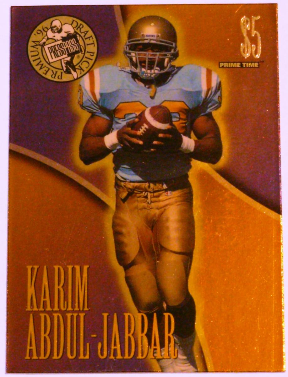 The card has a prominent "$5 Prime Time" denomination in the top right corner, indicating its collectible value. The upper left corner contains a circular "1996 Premium Press Pass Draft Pick" logo featuring a football player in action. Karim Abdul-Jabbar's name is printed in large gold letters vertically along the left side of the card. The design uses a warm color palette with deep purple and gold tones creating a bold and dynamic background.
