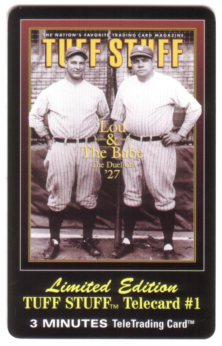 The phone card is branded as a "TUFF STUFF" telecard issued by TeleTrading Cards Inc. It is identified as "Telecard #1" within the series and has a call time of 3 minutes. The top of the card includes text referring to TUFF STUFF as "The Nation's Favorite Trading Card Magazine." The center of the card holds the title in gold-yellow text: "Lou & The Babe The Duel Of '27," highlighting the famous 1927 season that is often regarded as one of baseball's greatest.