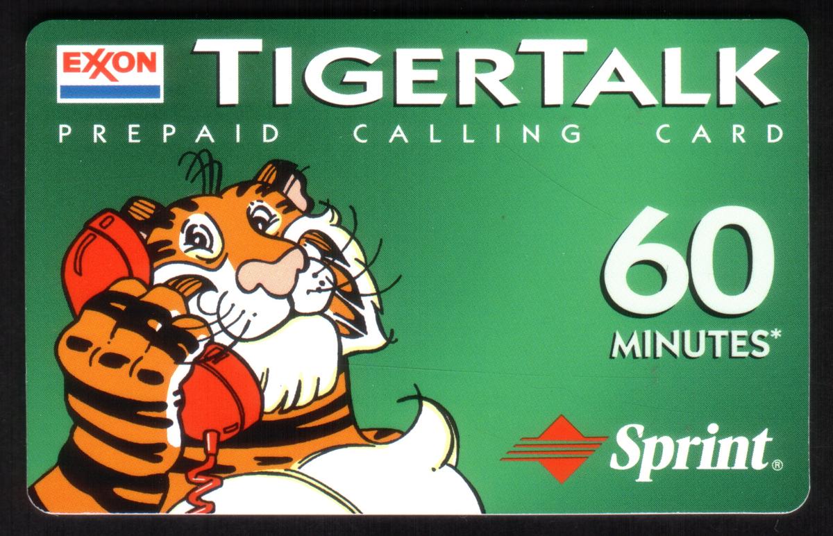 Exxon TigerTalk prepaid calling card featuring a cartoon tiger with a phone, 60 minutes talk time, and logos from Exxon and Sprint. |