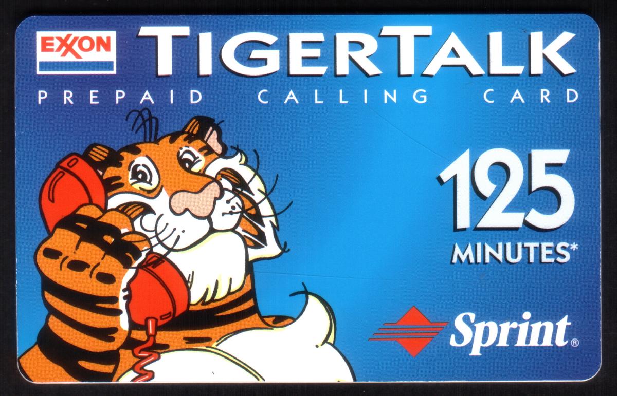 Exxon TigerTalk prepaid card featuring a cartoon tiger, vibrant blue background, 125 minutes talk time, and Sprint partnership for long-distance calls. |