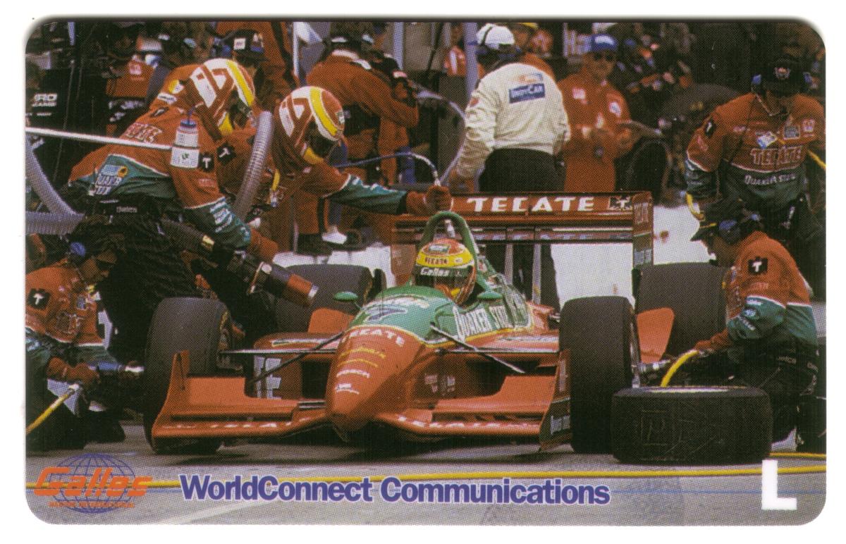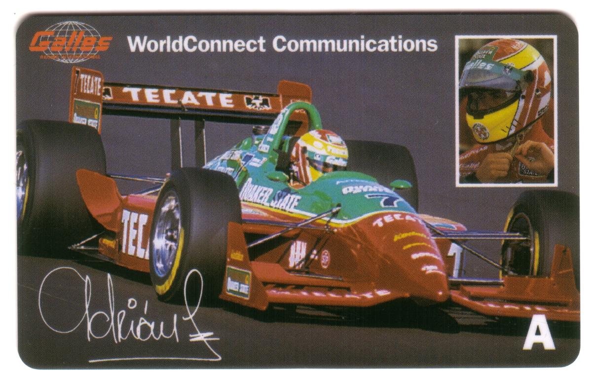 These collectible phone cards from WorldConnect Communications feature the 1994 Galles Racing IndyCar team. The first phone card prominently displays a green and red IndyCar race car with "TECATE" and "Quaker State" sponsorship logos. The driver is shown inside the car wearing a yellow, white, and green helmet with visible sponsor decals including "Tecate." The card also includes an inset close-up image of the driver adjusting his helmet, emphasizing the racing theme. The Galles Racing logo appears in the top left corner alongside the WorldConnect Communications logo at the top center of the card. The card has a large white signature printed in the bottom left corner and a large letter "A" in the bottom right.