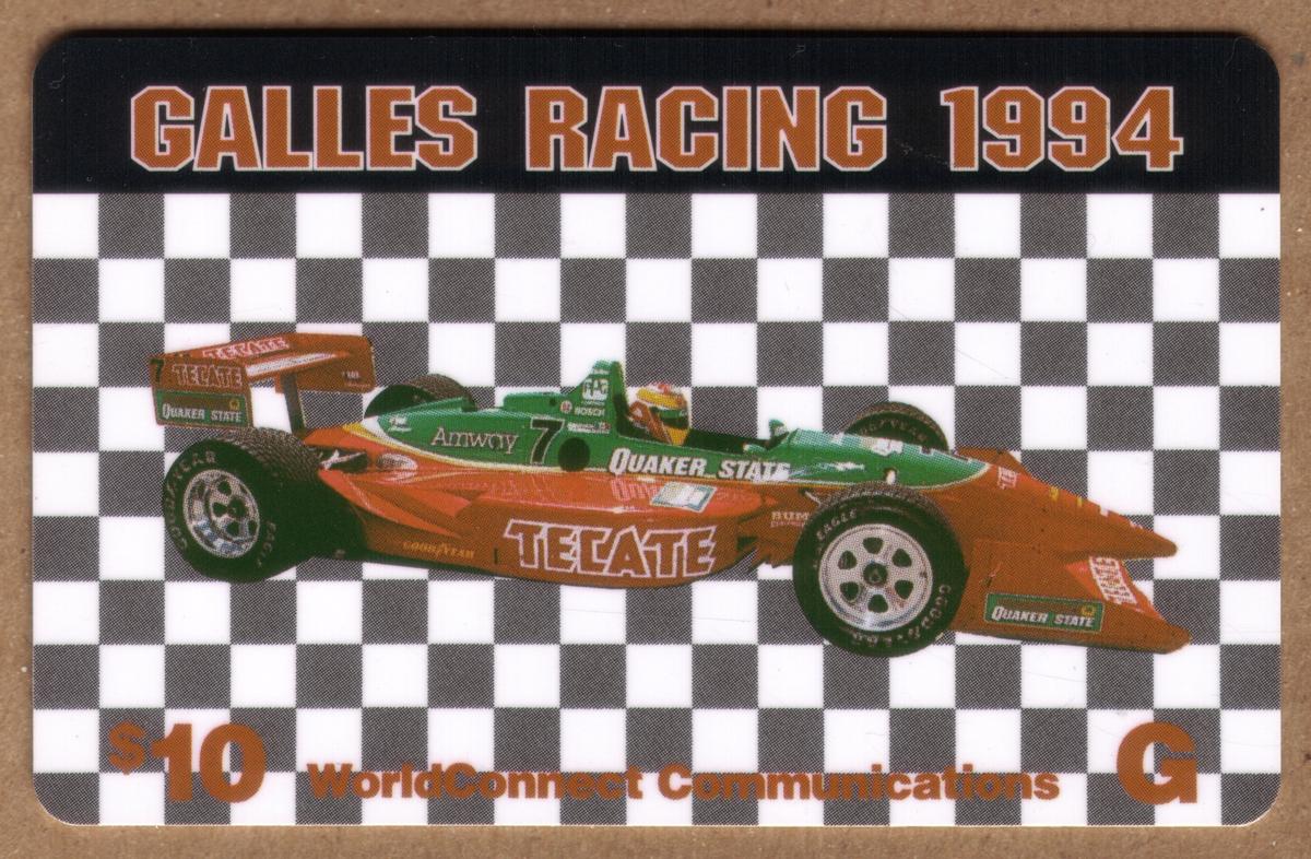 The third card, marked with the letter "G," shows a side profile of the 1994 Galles Racing IndyCar set against a black and white checkered background. The car prominently displays sponsors Tecate, Quaker State, and Amway, as well as the team’s green and red color scheme and the number "7" on the car’s nose and side. The text "GALLES RACING 1994" is printed in orange capital letters at the top. The value "$10" and "WorldConnect Communications" are printed at the lower left in orange and brown text, complementing the car’s sponsor branding clearly associated with the 1994 IndyCar racing season.